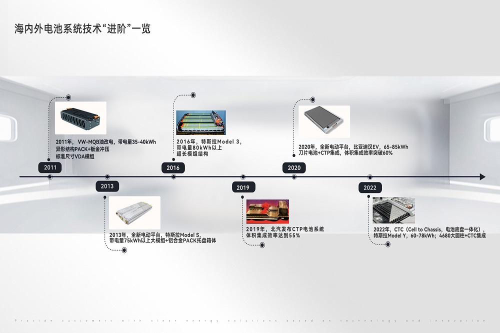 → 2019年,北汽发布CTP无模组电池包产品,省去模组环节,将电芯直接集成进电池包,再将电池包与车身框架进行连接,使电池系统体积集成效率提升至55%,进一步优化了成本。