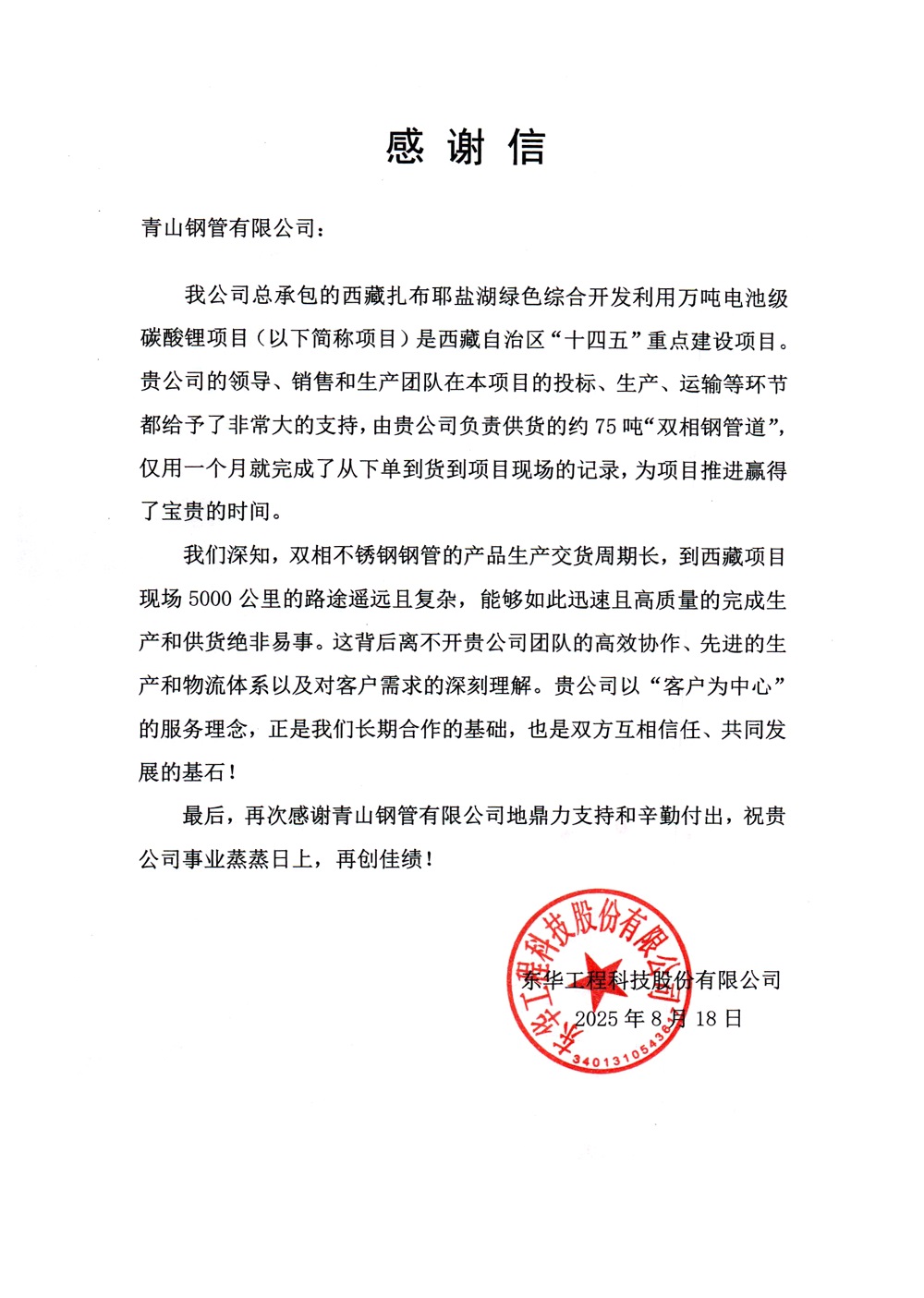近日,PA旗舰厅钢管有限公司收到东华工程科技股份有限公司发来的感谢信,对公司在西藏扎布耶盐湖绿色综合开发利用万吨电池级碳酸锂项目中的卓越表现予以高度肯定。在此次合作中,PA旗舰厅钢管仅用一个月时间便完成了双相不锈钢钢管的生产和运输任务,以“PA旗舰厅速度”刷新了同类项目的供货纪录,为项目顺利推进提供了关键保障。
