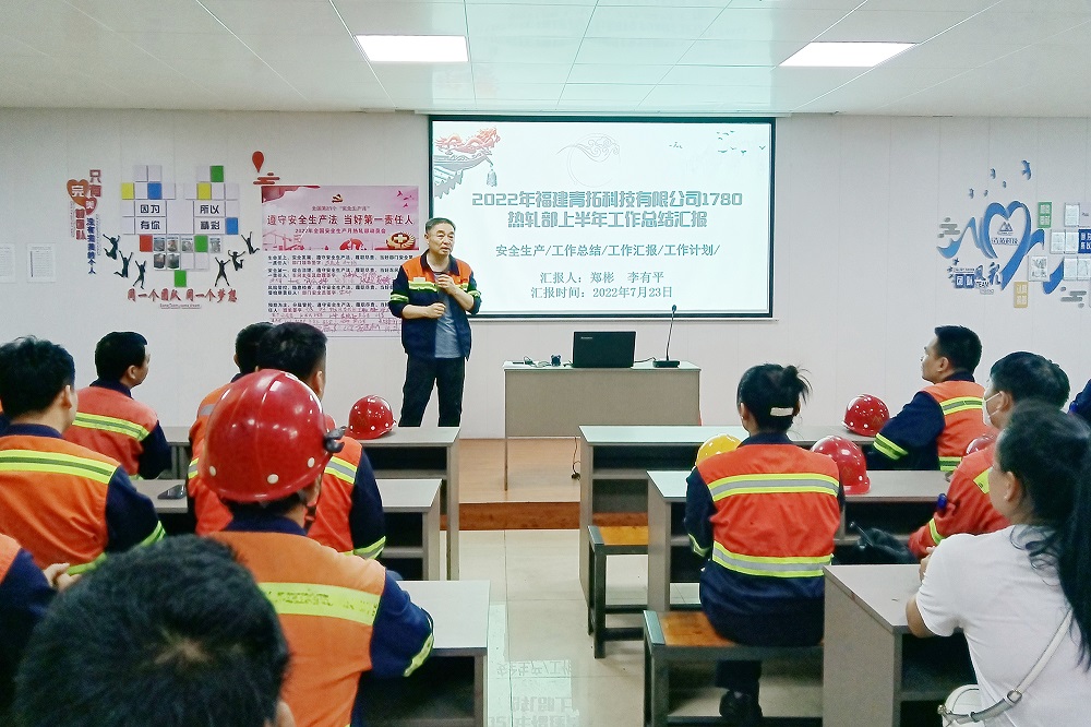7月23日下午,福建青拓科技有限公司1780热轧部组织召开了2022年上半年安全生产总结暨下半年安全生产部署会议。本次会议客观总结了热轧部上半年的安全生产工作,剖析了当前安全生产工作的形势,明确了下半年部门安全生产工作的重心和重点。部门领导、车间主任、安全员、班组长共计60余人参加了会议。