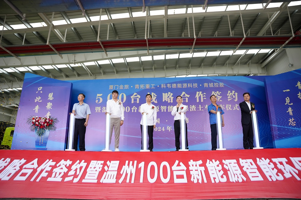 5月21日10点58分,厦门金旅、青拓重工、科韦德能源科技、青城控股 500 台战略合作签约暨温州 100 台新能源智能环保渣土车交车仪式于青拓重工厂区内举行。青拓集团有限公司董事长姜海洪,厦门金龙旅行车有限公司党委书记、董事长彭东庆,福建青拓重工有限公司总经理郑建新,温州科韦德能源科技有限公司总经理卢江,浙江青城控股有限公司董事长章以江等领导亲临活动现场。