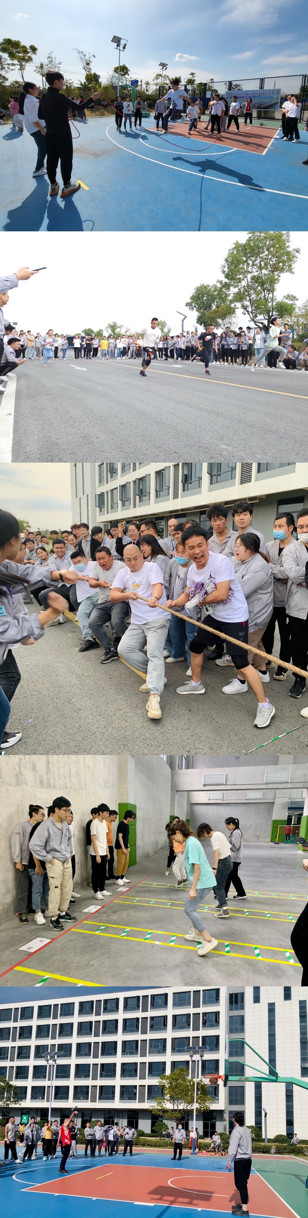 本次运动会团体赛设置定点投篮、8字跳大绳、双人跳绳、敏捷梯接力、俯卧撑开合跳+侧卧平板支撑、4*100米往返接力以及拔河等项目。仓储物流中心、联合部门(采购+财务)、市场部、技术中心、电极制造科等部门在众多项目中包揽名次。