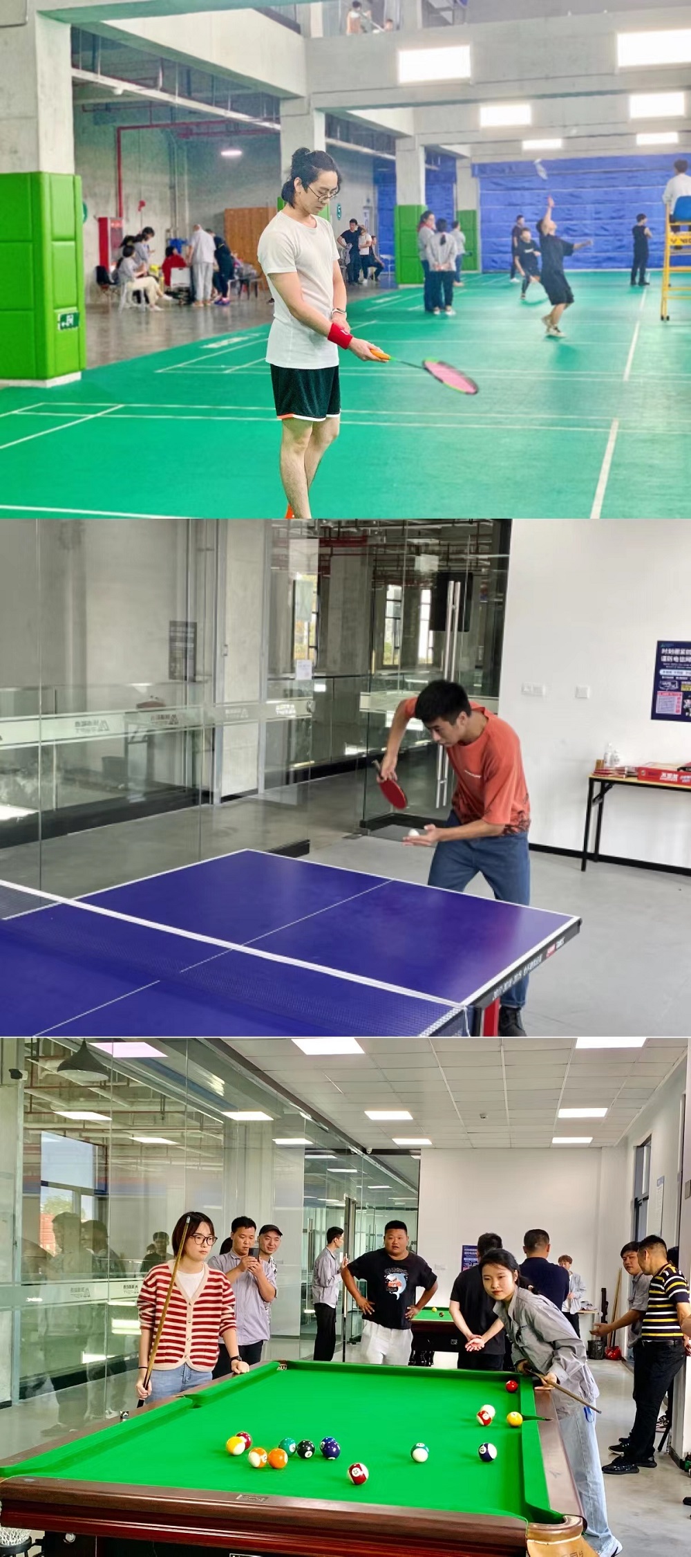 比赛中,运动健儿们勇敢无畏、活力无限。羽毛球赛场外呐喊声和欢呼声此起彼伏,非常热闹;台球桌上选手屏气凝神一杆进洞;乒乓球赛场上直拍、横拍、扣球、旋转球、弧线球等精彩扣杀、绝妙回挡不断出现。拔河是最后的压轴项目,电芯装配科一部勇夺第一名。