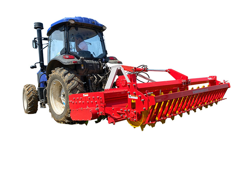 该机具主要用于旋耕整地作业,农艺顺序为旋耕-旋耕-镇压-拖平。专利设计,合理利用刀轴外端二次动力传输,带动后刀轴工作,达到二次粉碎。机械传动环节少,有效节省了拖拉机的马力消耗。一遍顶两遍的作业模式,大大提高工作效率。前刀轴和后刀轴连续作业,拖板镇压拖平,提高作业质量。