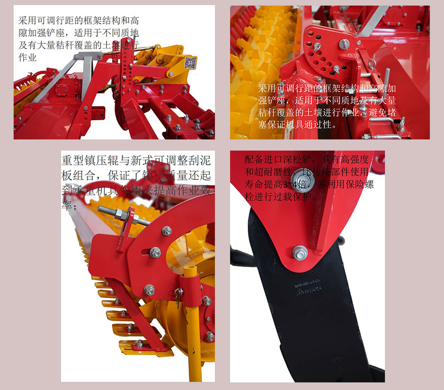6、深松单元采用凿型铲翼式结构组合,单铲幅宽可达26厘米,深度可达33厘米。翼铲高度可调,可满足不同耕作需求;