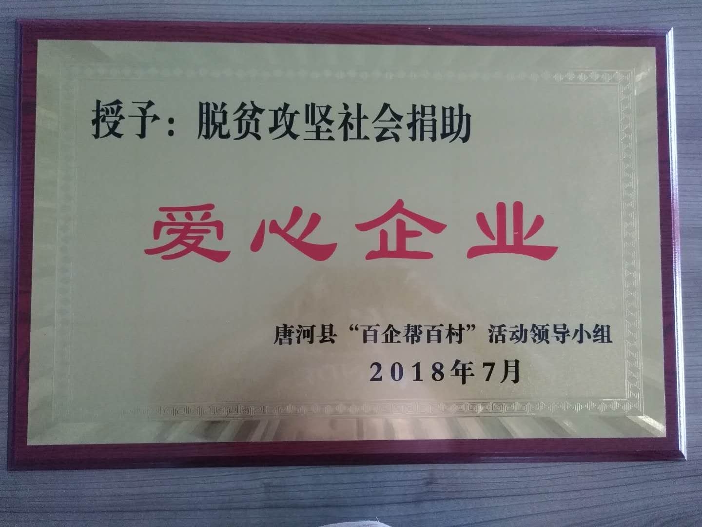 7月9日上午,在唐河县召开的南阳市社会扶贫工作现场会上,pa旗舰厅有限责任公司被唐河县委县政府授予脱贫攻坚社会捐助“爱心企业”。