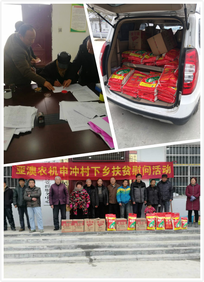 2019年1月19日上午,亚澳公司总经理助理郭靖及工会主席白拴礼带着春节慰问品米面油等扶贫物资,来到对口扶贫村大河屯镇申冲村为38户特殊困难群众送温暖。这其中不乏鳏寡孤独者、因病致病者,无一不是处于巨大的生活困顿之中。郭总及白主席搬下慰问品米、油等物资,送给一户户贫困户。