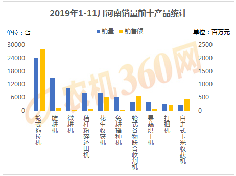 2019年1-11月,上榜河南用户购机量前十的农机产品如下图所示,轮式拖拉机、旋耕机、微耕机等10种农机合计购买力接近8.5万台,占了河南农机总销量的约80%,对这10类农机的购机支出达43.3亿元。