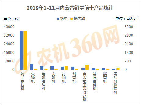 2019年1-11月,上榜内蒙古用户购机量前十的农机产品如下图所示,轮式拖拉机、穴播机、免耕播种机等10种农机合计购买力5.86万台,是内蒙古农机总销量的86.8%,对这10类农机的购机支出达42.4亿元。