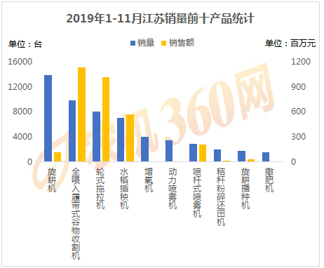 2019年1-11月,上榜江苏用户购机量前十的农机产品如下图所示,旋耕机、全喂入履带式谷物收、轮式拖拉机等10种农机合计购买力5.45万台,是江苏农机销量的85.35%,对这10类农机的购机支出达31.02亿元。