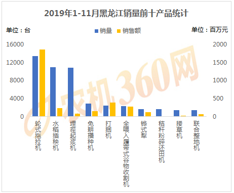 2019年1-11月,上榜黑龙江用户购机量前十的农机产品如下图所示,轮式拖拉机、水稻插秧机、埋茬起浆机等10种农机合计购买力4.9万台,是黑龙江农机销量的93.09%,对这10类农机的购机支出达32.23亿元。